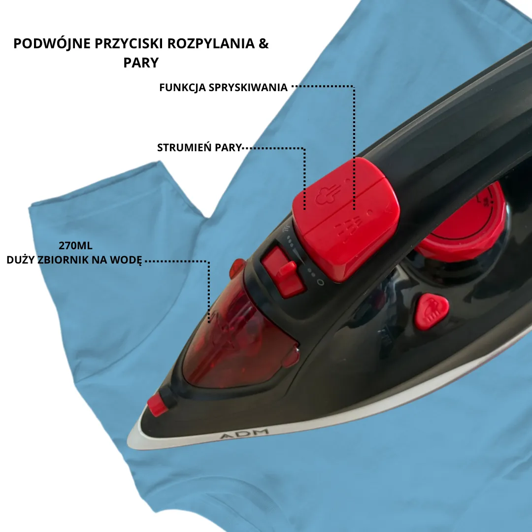 • Mocny wyrzut i stała para – liczne otwory dla równomiernego nawilżenia tkanin, łatwiejsze prasowanie grubych materiałów. ?