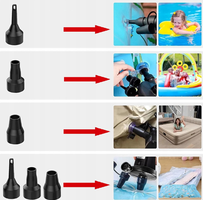 • Uniwersalność3 dysze pasują do większości zaworów materacy/basenów/pontonów.