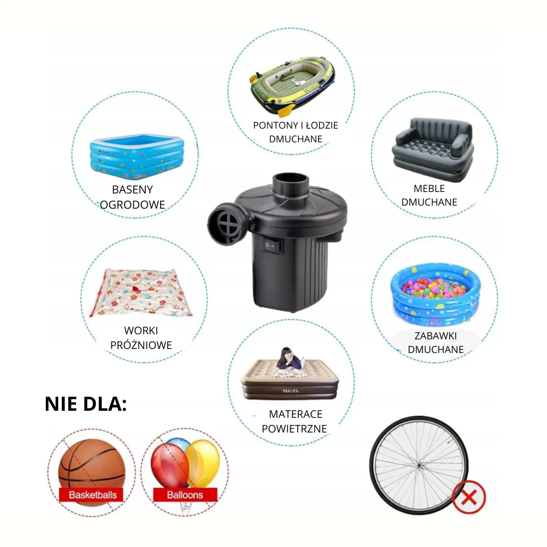 Skończ z długim pompowaniem i zmęczonymi rękami. Kompaktowa pompka elektryczna ADM FY-568 (50 W) błyskawicznie nadmucha materace, pontony, baseny i zabawki dmuchane, a po wszystkim równie szybko je opróżni. Lekka, wytrzymała, z 3 końcówkami w zestawie – idealna do domu, nad jezioro i na kemping. Podłączasz, włączasz i po minucie gotowe. ?