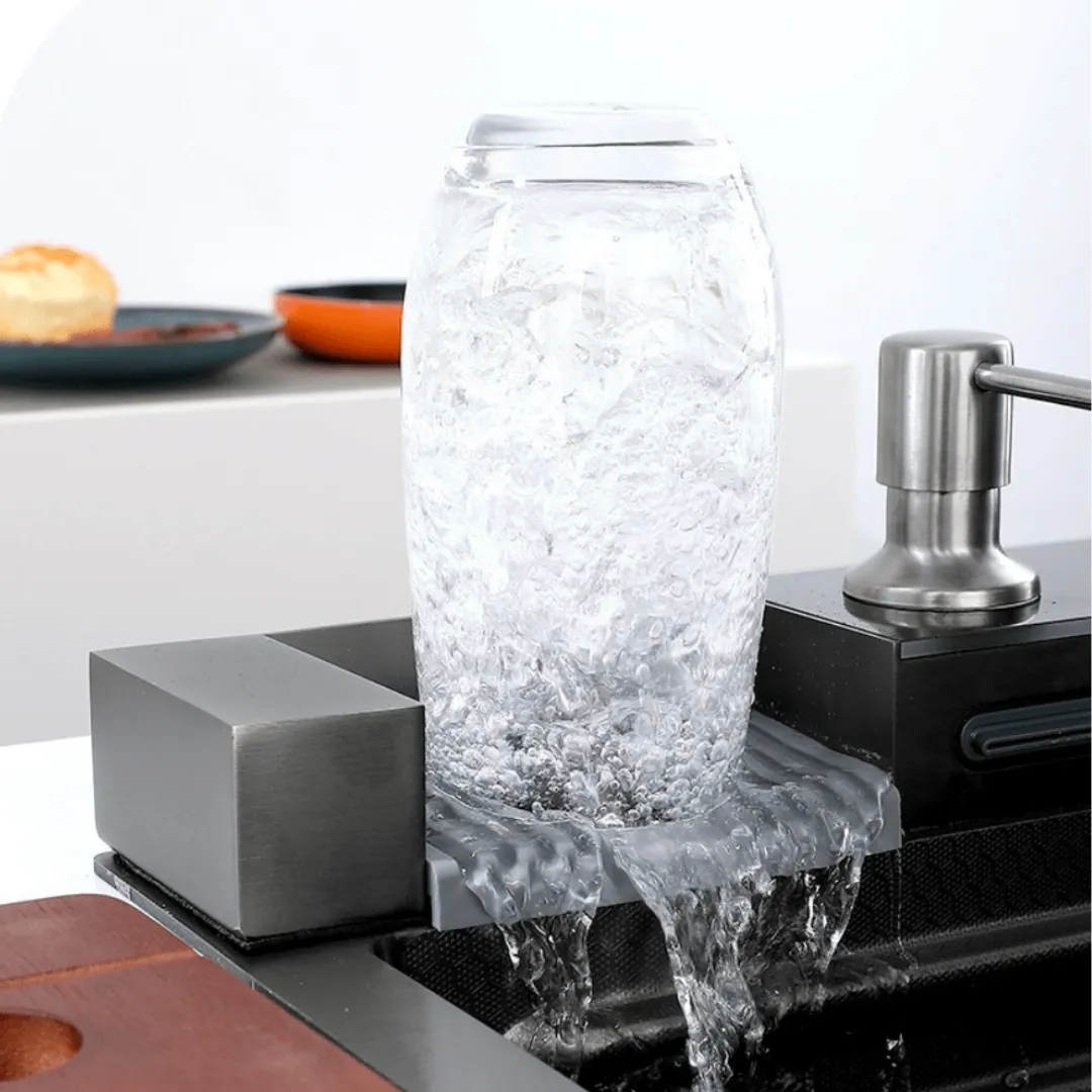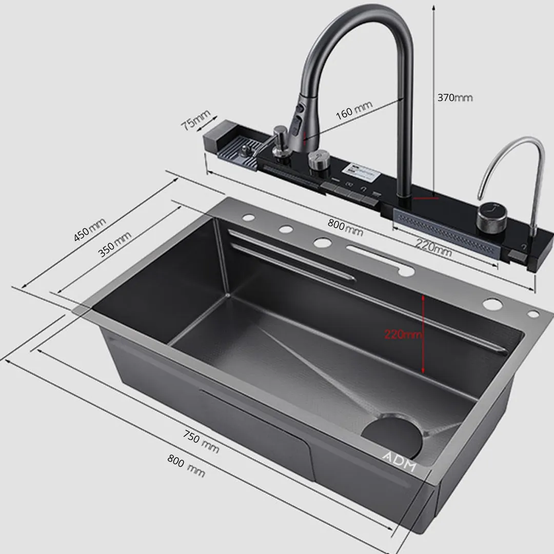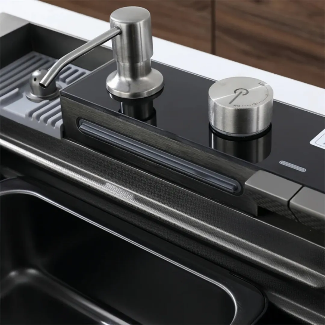 Inteligentny zlewozmywak – stal nierdzewna, panel cyfrowy LCD, bateria to praktyczne, nowoczesne urządzenie zaprojektowane z myślą o wygodzie użytkowania w domu.