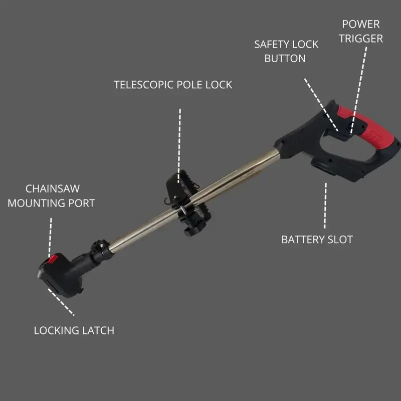 Teleskopowy wysięgnik pozwala zwiększyć zasięg mini piły łańcuchowej, umożliwiając wygodne docieranie do wyżej położonych gałęzi bez korzystania z drabiny.
